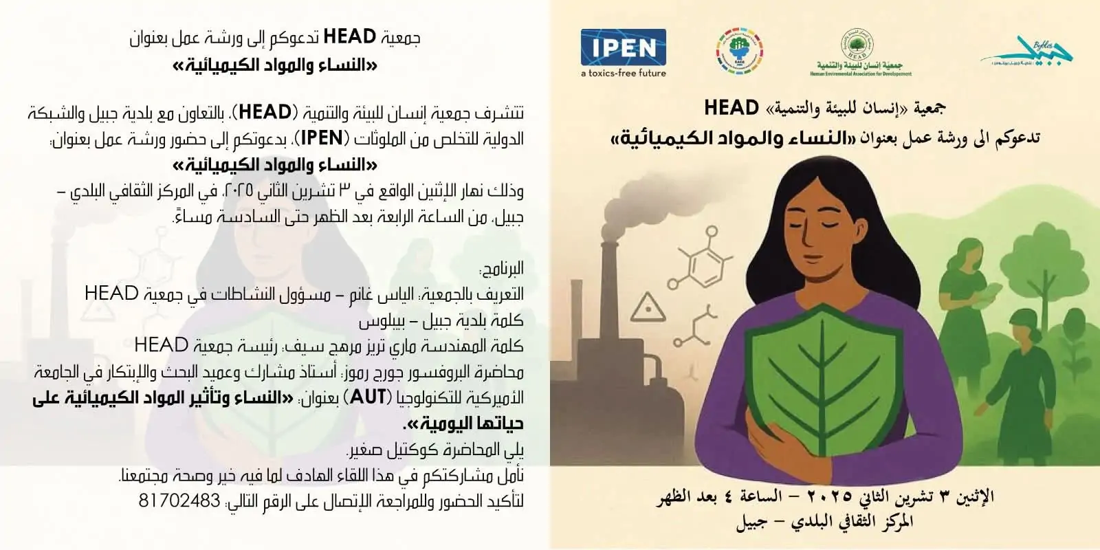 نظمت جمعية إنسان للبيئة والتنمية(HEAD) بالتعاون مع بلدية جبيل والشبكة الدولية للتخلص من الملوّثات(IPEN), ورشة عمل بعنوان” النساء والمواد الكيميائية”، وذلك في المركز الثقافي البلدي في جبيل.